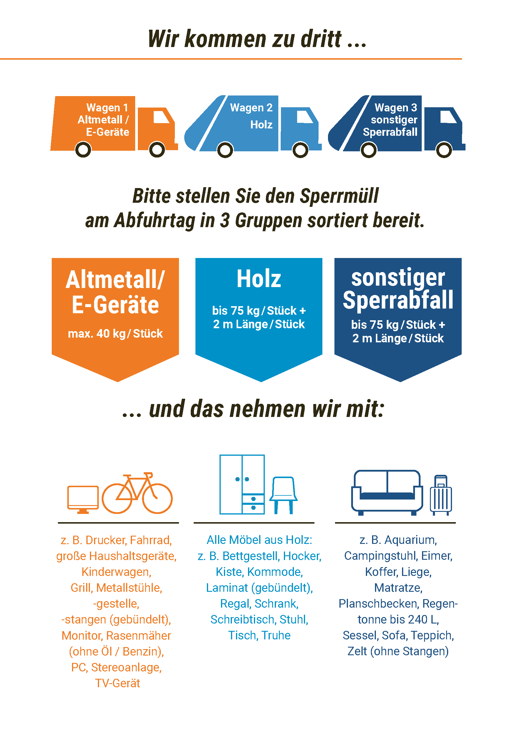 Bitte stellen Sie den Sperrmüll in drei separaten Fraktionen bereit: